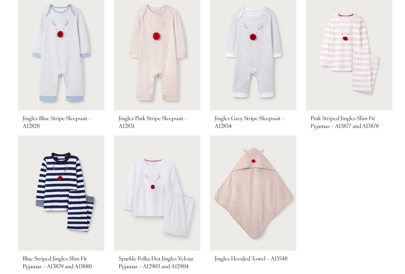 Product description: sleepsuits, pyjamas, and hooded towels from the Jingles Reindeer range that include a coloured stripe with reindeer antlers and a red 3D pom-pom for the reindeer’s nose, sold in store and online since 14th October 2024.